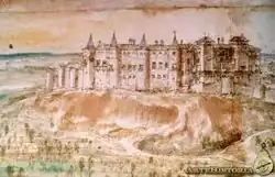 The first drawing of the Alcázar was done by Jan Cornelisz Vermeyen in 1534,[2]: 7 three decades before Madrid was named as the capital of Spain. The drawing shows a castle divided into two main parts, which may correspond, at least partially, to the structure of the Muslim fortress on which it was built.