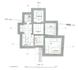 The underground chambers were accessible through a square vertical shaft that ended with a central vestibule. The four faces of the shaft were roughly aligned with the cardinal points and measured around 3.7 m (12 ft) each. The depth of the well, down to the vestibule floor, was 10.2 m (33 ft), including the 1 m (3.3 ft) meter deep soil layer. On the eastern wall of the well, at a depth of 6 meters, three rows of well-cut ashlar blocks were laid to prevent the collapse of the shaft. The vestibule opened on all four sides, at varying depths, into four different funerary vaults, to which Hamdi Bey assigned Roman numbers as they were being cleared: Vault I to the East, Vault II to the West, Vault IV to the South, Vault V to the North (see attached diagram).[50]