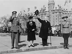 In 1941, Prince George, Duke of Kent visited several Royal Canadian Air Force bases in Canada.[1] In the same year, Edward, the Duke of Windsor (formerly Edward VIII) visited Canada to stay at his private ranch in Alberta. He entered Canada at North Portal, before proceeding towards Calgary the next day. As the visit was only few years removed from the 1936 abdication crisis, he was initially discouraged from visiting by the Canadian Prime Minister, William Lyon Mackenzie King. However, King would later send Edward a telegram welcoming him shortly after he entered the country.[114] Edward departed Canada after spending nine days there, summoned back to the Bahamas as its governor, after a hurricane struck the islands. Edward would visit Canada on two more occasions, visiting New Brunswick in 1945, and Alberta in 1950. During his time in Alberta, Edward slept at the viceregal suite of the Palliser Hotel in Calgary; as the state of his ranch had deteriorated in the years since his last visit. In 1945, Edward sought the appointment as the Governor General of Canada, although failed to obtain it.[114]