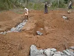 The rubble trench foundation, an ancient construction approach popularized by architect Frank Lloyd Wright, is a type of foundation that uses loose stone or rubble to minimize the use of concrete and improve drainage.[1] It is considered more environmentally friendly than other types of foundation because cement manufacturing requires the use of enormous amounts of energy. However, some soil environments are not suitable for this kind of foundation, particularly expansive or poor load-bearing (< ~100 kN/m² or 1 ton/sf) soils.[2] A rubble trench foundation with a concrete grade beam is not recommended for earthquake prone areas.[3]