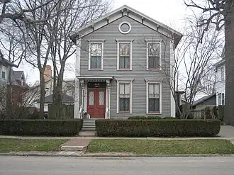The home was constructed in 1856 by John L. Routt. It is the only home in Bloomington that can be definitively attributed to Routt.[2] The rectangular two-story house was built for lawyer and Bloomington resident Ruben M. Benjamin. Benjamin was a prominent attorney who represented the people in The People vs. Chicago and Alton Railroad as well as helped to develop the famed Granger cases. The railroad case was widely considered a benchmark ruling that allowed the government to regulate private enterprises.[2][3]