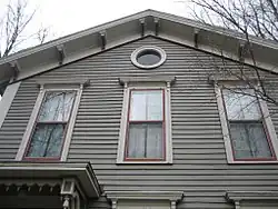 The home is cast in the Classical Revival architectural style. The house was built by Routt, who later became the first governor of the state of Colorado.[2] Simple in its design, the exterior of the house has remained almost unchanged since the late 19th century, and possibly before that.[4] The front of the house and the end of its gabled roof face East Grove Street to the south. The second story features three rectangular windows, with a circular window gracing the gable end at the third floor attic. At its front and back ends, the roof is supported by shallow wooden brackets. The double front door has a small flat roof overhanging it, and the west side of the house features a bay window.[2][4]