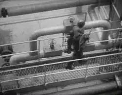 A Cartier location shot from Quatermass II (1955), looking down from one of the towers of the Shell Haven oil refinery. Such ambitious location work was new to British television.