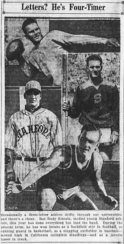 Rintala also starred as a center fielder for the Stanford baseball team, batting cleanup[6] and serving as team captain in 1932.[7] He also was a starting guard for the Stanford basketball team,[8] and threw javelin for the school's varsity track and field squad.[9]