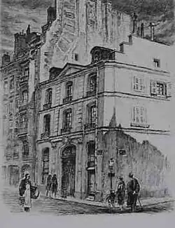 - No. 26: remains of the Théatins convent.[27] Established in Paris in 1644, the Théatins, thanks to the generosity of Cardinal Jules Mazarin, bought a house on the site of today's 23, quai Voltaire, which could house 25 monks. They decided to build a church, under the invocation of Sainte-Anne-la-Royale, in honour of Anne of Austria. Work began in 1661 on plans drawn up by a military architect, Maurizio Valperga. In October 1662, the general of the Theatines replaced Valperga with a pupil of Borromini, Camillo-Guarino Guarini, who designed an enormous and complicated Baroque edifice,[notes 1][28] the cost of which exceeded the Theatines' financial possibilities. Guarini abandoned the project in 1666 when only the arms and pillars of the transept crossing had been built. All that remained was to cover the transept, which became the nave of the church. The building was then completed by architect Nicolas Liévain around 1720-1721, without repeating Guarini's design. The convent was abolished during the French Revolution. For a few years, it was converted into a concert hall and café, before being almost destroyed in 1823. Remains of the eastern façade can be seen in the courtyard at 13, quai Voltaire, while the former chapel of Saint-André-Avelin, built by Liévain, remains, albeit altered, in the courtyard at 30, rue de Lille. Two passageways were also created, opening onto the quay and the street through gates designed by architect Pierre Desmaisons. The gateway on rue de Lille has been preserved and is now no. 26. The gate gives access to a vestibule onto which open the staircases serving the buildings on either side of the passage. The rectangular courtyard is decorated with a Doric order. The whole was engraved by La Marcade.