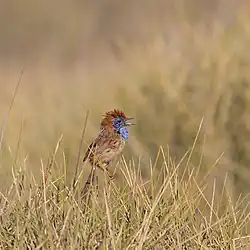 The rufous-crowned emu-wren is one of three species of the genus Stipiturus, commonly known as emu-wrens, found across southern and central Australia. It was first described in 1899 by Archibald James Campbell, more than a century after its relative the southern emu-wren. Its species name is derived from the Latin words rufus "red" and caput "head". No subspecies are recognised, although birds from Western Australia may have redder plumage, and females more blue on the face and lores. It has been considered a subspecies of both the southern and mallee emu-wrens in the past.[2] The common name of the genus is derived from the resemblance of their tails to the feathers of an emu.[3]