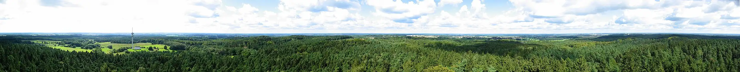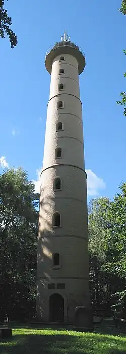 In June 1907 the Marnitz Veterans' and Military Society (Krieger- und Militärverein Marnitz) proposed the erection of a Moltke Tower. A competition for one did not take place until 1913 however. The project was finally shelved in 1916 due to a lack of materiel and the start of the First World War; and the donations collected were given to a charity for surviving dependents of those killed in the war. Almost 20 years later a similar project was begun in earnest. In 1933 an observation tower was built on the Ruhner Berg. The wooden tower was replaced in 2000-01 by a 32 metre high brick tower. From the observation deck there is a view of the wooded countryside of the Ruhn Hills, and the vista stretches as far as the Mecklenburg Lake District, the Prignitz lowlands and the River Elbe. The tower was funded by EU donations, donations from firms in the region and private individuals as well as the surrounding parishes, whose coats of arms are displayed on metal shields inside the tower. In addition to its touristic function, the tower is also used as a mobile telephone mast.