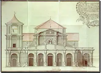 The church was built on a stylobate with six wide steps. The façade was preceded by a large galilee with seven round arches alternated with semicircular pilasters in white and red stone, slightly raised to compensate for the optical distortion, and with composite capitals, which supported a lowered triangular pediment and gave access to three rectangular doors, the central one being the largest. Inside the galilee, on the right, there was a gilded carved altar and a glazed ceramic basin that served as a baptistery. The cornice was carved with friezes in relief and six statues of apostles were placed on the pediment in line with the columns. The second level of the body of the temple could be seen from behind, with a central niche for a statue of St Michael, and above this block, a new triangular pediment, crowned by a cross. A massive square tower was built on the side, with an arch at the base and two upper levels, the last with an arched opening for six bells and finished with a tent-shaped spire roof, topped by an iron cross. The tower was 14 metres (46 ft) high and 8 metres (26 ft) wide. The galilee must have been added after the church was completed, as it just leans against the adjacent wall and has no moorings.[24]: 65–66 [13]: 120–122