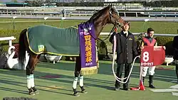 In the Japan Cup on November 25, despite a slow start and a blistering final 600m (32.7 seconds), he finished 3rd behind Gentildonna and Orfevre.[27] His final start, the Arima Kinen on December 23, was marred by a 10-length delay at the gate after he stood up in the gate. Rallying from last, he managed to catch up with the pack, finishing 3rd behind Gold Ship and Ocean Blue. This was his third consecutive third-place finish.[28][29]