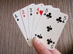 A run, straight or sequence is a combination of playing cards where cards have consecutive rank values.[1] The cards do not normally need to be in one type of suit. However, if they are, this is referred to as a suit sequence.[2] Some games, such as cribbage, specify that an ace counts as one ("ace low"); others, such as spades, specify that an ace counts above a King ("ace high"); yet others, such as poker, allow an ace to count either high or low.