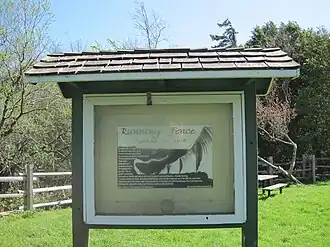 The route of the fence began near U.S. Highway 101 and crossed 14 roads and the private property of 59 ranchers to reach the Pacific Ocean south of Bodega Bay. The fence entered the Pacific Ocean at a point about midway between the Estero Americano and the Estero de San Antonio, in northwestern Marin County.[3] The art project required 42 months of collaborative efforts, 18 public hearings, 3 sessions at the Superior Courts of California, and the drafting of an Environmental Impact Report (EIR); the required EIR for the piece was 450 pages long.[2]