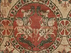 As a daughter of Charlemagne, Ruothild probably received an education.[6] Later legend relates that her father gave her a gilt silver reliquary containing a piece of the True Cross.[7] As abbess, she oversaw the transfer of the relics of Burgundofara, the founder and namesake of Faremoutiers, to a new shrine. She had the body wrapped in a red Byzantine silk decorated with bare-breasted Amazons. Her choice of silk suggests familiarity with Orosius' Seven Books of History Against the Pagans, the standard text on the Amazons at the time.[8]