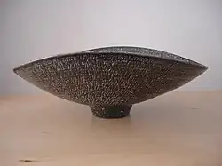 His best and most recognisable work contains poems, both self-written and by Kathleen Raine the celebrated British poet. The poems are either scratched into the glaze in the sgraffito style or written as embossed letters either in a square block or in a single line across the surface of the vessel.[6] These works vary in size from small prayer bowls only a few centimetres across through to huge, open bowls 50 cm or more in diameter.