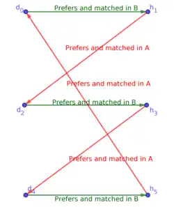 Similarly, since matching B is stable, d2 prefers its hospital in B over h1; denote this hospital by h3, and denote the prefererence by a green arrow from d2 to h3.
