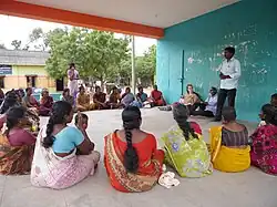 The self-help group in India is an action taken in a group in a wide range, which helps approximately 33 million of Indian women to obtain financial services and other activities with lower prices. Women in rural India, especially with lower castes and lower education level, facing a plight such as the adverse health condition and limitation to acquire financial products.[23] There are commonly 10 to 20 members in a rural self-help group, who funded money mutually for the enterprise or emergency. For example, in Tamil Nadu, India. The new self-help groups established after the natural disaster.[24] One of the famous models launched in rural India is to provide microcredit to poor Indian women.[25] The initiatives of rural development in India concentrate on the development of the economic status of women and other vulnerable people by providing micro-credit.[23] Besides, there is another model not only offer the Microfinance plus[25] but also involved in the areas of education, social attendance, and politics. The self-help group has ethical implications for Indian women, such as alleviating the economic burden and eliminating gender inequality. After accessing the loan products, there is an improvement for rural women in the aspects of psychological and economic conditions.[23] Moreover, women who are widowed will receive support.[24] In South India, the large proportion of rural women, especially widows, experienced poverty, uncertainty in the inheritance of land, and barriers of involving in community.[23] The existence of the rural self-help group is to empower the vulnerable group, especially women, to conquer the barriers.[23]