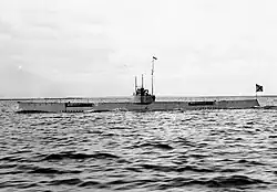 Akula provided security for a minelaying operation by Russian surface ships in October 1914 near of the island of Bornholm.[6] On 10 October, it ran aground in the Soeloesund and was refloated with assistance from another warship.[12] During next year's campaign, following the freezing of the Baltic over the winter, it was sent along with the British HMS E1 and E9 to counter German naval activity near the Gulf of Riga.[13] Akula became the first Russian submarine to actively go on the attack against enemy ships at sea instead of waiting for them to arrive at a predetermined position.[6] After the Imperial German Army occupied the port of Libau it was turned into a forward base for the German fleet in the Baltic and Russian submarine activity in opposition to the German presence increased. On 21 May 1915 Akula attacked the SMS Beowulf, a German coastal defense ship on its way to Libau, by firing two torpedoes, but both of them missed. The next day a German aircraft located Akula traveling on the surface, based on reports from the U-boat SM U-26, and dropped four bombs, though they missed and did not cause any damage. Akula was able to get away.[14]
