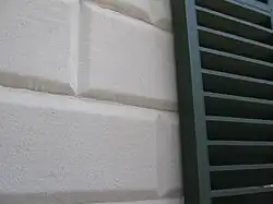 During the 18th century, following the Palladian revival, rustication was widely used on the ground floors of large buildings, as its contrived appearance of simplicity and solidity contrasted well to the carved ornamental stonework and columns of the floors above: "Rustication became almost obligatory in all 18th- and 19th-century public buildings in Europe and the USA".[6] A ground floor with rustication, especially in an English mansion such as Kedleston Hall, is sometimes referred to as the "rustic floor", in order to distinguish it from the piano nobile above. As well as uses emphasizing the horizontal, rustication is often used in relatively narrow vertical bands, on the quoins at corners or elsewhere.[7] Rustication may also be confined to the surrounds of arches, doors or windows, especially at the top. In these and other situations where rustication stops horizontally, the edge is usually made up of vertically alternating long and short blocks.[8] Rustication therefore often reverses the patterns of medieval and later vernacular architecture, where roughly dressed wall surfaces often contrast with ashlar quoins and frames to openings.