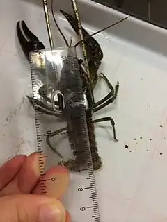 Adult rusty crayfish can reach 10 centimeters (4 inches) in length, although they reach maturity at about 4.4 cm (1.7 in),[11] and can range in color from greenish grey, to reddish brown,[12][13][14] They can be easily recognized by two "rusty", reddish colored spots on the sides of their back and their large front claws with black bands around the tips.[15] Male rusty crayfish have small hook-like features on their first pair of hind legs that they use to hold onto a female while mating.[7]