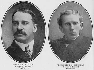 Rutan and Russell were in partnership until Rutan's death on February 25, 1911, in Atlantic City, New Jersey. Russell then formed a partnership with his younger brother, Edward Pollard Russell, who had worked for Longfellow, Alden & Harlow before joining Rutan & Russell. The younger Russell died January 15, 1920, in Pittsburgh.[4] Frederick A. Russell then formed a partnership with Eric Fisher Wood, who had joined the firm a year before. Russell died February 25, 1921, exactly ten years after Rutan.[5] In 1922 Wood reorganized the firm under his own name.[6]