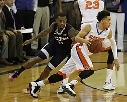 Upon arriving at Connecticut, his eligibility was challenged.[5] After he missed the first three games, the National Collegiate Athletic Association ruled that he would have to serve an additional three-game suspension to bring his total to six games served due to "receiving improper benefits", consisting of more than $8,000 in cash and other impermissible benefits that he and his mother had received.[6][7] Upon further review, Boatright's suspension was increased to a total of nine games.[8] Nonetheless, as a freshman he averaged 10.4 points, 4.0 assists and 3.3 rebounds in 30.1 minutes per game.