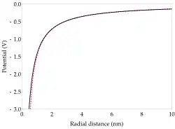 Figure 3. A comparison of the potential in a hydrogen atom with that in a Rydberg state of a different atom. A large core polarizability has been used in order to make the effect clear. The black curve is the Coulombic 1/r potential of the hydrogen atom while the dashed red curve includes the 1/r4 term due to polarization of the ion core.