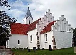 The oldest parts of the church building was likely constructed in the end of the 1100s when a stone church replaced an original wooden structure. In the late Middle Ages the church was expanded and the original flat wooden ceiling was replaced with Gothic rib vaults. The first tower, a Stilt Tower, is likely from this period as well. In 1883 the church got its present tower. In 1870 the church was extensively renovated and crow-stepped gables were added and the north door was walled off.[3][4]