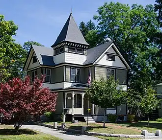 The S.A. Hall House is an historic house located at 147 North Main Street in Uxbridge, Massachusetts. It is a 2+1⁄2 story wood-frame structure, with a cross-gable roof, clapboard and wood shingle siding, and a granite foundation. A three-story square tower stands in a crook at the front of the house, topper by a pyramidal roof with a flared edge and bracketed eave. It has decorative cut shingle work in the gables and in bands between the levels. Its front porch, set in front of the tower, has a decorative bracketed frieze and turned posts. Built c. 1890, it is one of Uxbridge's finest Queen Anne houses. Its first documented owner (in 1898) was S. Alonzo Hall, publisher of the Uxbridge Compendium.[2]