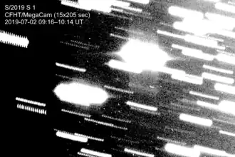 ![]() Canada–France–Hawaii Telescope image of S/2019 S 1 (center), revealed by stacking many images while following the moon's motion | |
