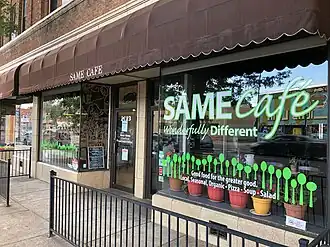 The SAME Cafe is a nonprofit community cafe with locations in Denver, Colorado, United States and Toledo, Ohio, United States. Brad and Libby Birky invested $30,000 to open the original restaurant at 2023 East Colfax Avenue, Denver, on October 20, 2006, inspired by their background in community service and a visit to the One World Cafe in Salt Lake City, Utah.[1] They opened the second SAME Cafe site in November 2022, in the Main Library of Toledo, OH. The name is an acronym for "So All May Eat", and their motto is "Making healthy, organic food available to all". They offer higher quality food in a pay what you can format where the diner puts what they feel their meal was worth in a donation box. They also accept a 1/2 hour of volunteer help in exchange for a meal, made possible by Colorado laws which do not require a food handlers certificate for restaurant workers.[2]
