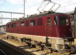 The Ae 6/6 is a class of heavy electric locomotive used by the Swiss Federal Railways (SBB). It is sometimes also referred to as "canton locomotive" (German: Kantonslokomotive), because the first 25 locomotives (a 26th was renamed after the separation of Jura) were named after the cantons of Switzerland and carried the canton's coat of arms on the side and chrome embellishments (a single raised stripe on each side and three raised stripes on each end), and the Swiss coat of arms on the front, between the chrome stripes. These adornments made them internationally famous. The other 95 (94) locomotives received the names of capital cities of Swiss cantons, and other towns and cities, but without the chrome embellishments. The namings were held as ceremonies in the respective cities. A less flattering moniker is Schienenwolf (lit.'railroad plough') as the three axle bogie construction stresses the tracks heavily.