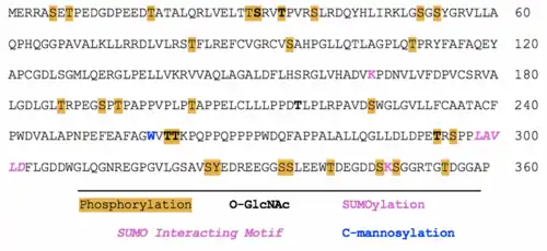SBK3 has 29 proposed phosphorylation sites at various serine, threonine, and tyrosine residues.[50] O-GlcNAc is predicted to occur at five threonines and one serine.[51] SUMOylation was predicted to occur at two lysine residues: K165 and K347; a SUMO-interacting motif was found between residues 298-302.[52] SBK3 is also predicted undergo C-mannosylation at a singular tryptophan residue: W258.[53]