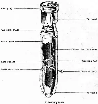 The SC 2000 had a single piece forged and machined steel body and was similar to the preceding SC 1800 in construction. Around the nose of the bomb was a kopfring - a metal ring, triangular in cross section, designed to prevent ground penetration or to stop forward momentum when hitting water. The SC 2000 was filled with Amatol, had a single transverse fuze like the SC 1800 and a central exploder tube which ran through the explosives. The SC 2000 had a circular braced tail ring with four fins. Inside the bomb casing there was a reinforced H-type suspension lug and it could be horizontally suspended in a bomb bay or horizontally mounted on a fuselage hardpoint. There were also lugs that could be fitted for dive bombing.[1]