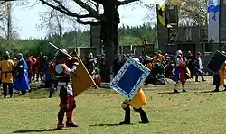 SCA armoured combat,[1] or informally heavy combat, is a combat sport developed by the Society for Creative Anachronism (SCA) in which participants in protective body armour compete in mock combat, individual tournaments inspired by forms of historical combat, and tournament combat practiced in medieval Europe. Groups also compete, under supervision, in group battles which may approximate historically real combat, using SCA approved safe weapons. Combats are performed under the watch of marshals to maintain safety.[2] It is variously considered a combat sport, contact sport, or a form of martial art.