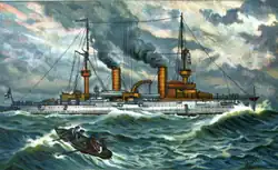 2. ^ Armored cruisers were vessels that generally possessed side armor intended to serve on foreign stations, as a fast wing of a fleet of battleships, or to attack or protect merchant shipping. Side armor differentiated them from large protected cruisers that only incorporated an armor deck for defense against enemy fire.[1]