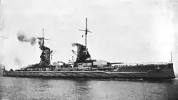 After her commissioning in January 1913, Friedrich der Grosse conducted sea trials before becoming the fleet flagship on 2 March,[8] replacing Deutschland.[10] The ship participated in her first round of fleet maneuvers in February 1913, which were conducted in the Kattegat and the North Sea. The next month saw another round of exercises, from 12 to 14 March. The ship went into dock for periodic maintenance in April, and was ready for artillery training by the end of the month. Extensive fleet maneuvers were conducted in the North Sea from 5 to 27 May. Friedrich der Grosse, as the Navy's newest battleship, was sent to Kiel for Kiel Week in June.[8] While there, she was visited by the Italian king Victor Emmanuel III and his wife Elena.[9] In mid-July, the fleet conducted its annual summer cruise to Norway, which lasted until mid-August. During the cruise, Friedrich der Grosse visited Balholmen, Norway. The autumn maneuvers followed after the fleet returned; they lasted from 31 August to 9 September. Unit drills and individual ship training were conducted in October and November.[8]