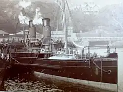 On 1 September 1873, during a voyage from Liverpool to Douglas, an explosion in her magazine injured several people, one seriously.[3] On 12 August 1878, she collided with Concordia, which was at anchor in the River Mersey. King Orry was undamaged and proceeded on her voyage to Douglas.[4] On 19 June 1884, the King Orry was required to go to the assistance of the Mona’s Isle which had suffered a mechanical failure.[5] Departing Liverpool at 13:05hrs with approximately 250 passengers embarked,[5] Mona’s Isle cleared the Victoria Channel and set a course bound for Douglas.[5] She passed the Tynwald, which was engaged in accompanying yachts racing in the Mersey, at 14:30hrs[5] which reported her to be making good speed. When approximately mid-channel the mechanical failure to her machinery occurred, forcing her Master, Capt. McQueen, to come to anchor and await the arrival of assistance.[5] As there was no wireless communication at that time, anxiety was caused in Douglas as the scheduled time of arrival of the Mona’s Isle passed, requiring the Isle of Man Steam Packet Company to contact their Liverpool office to ensure that she had departed on time.[5] This was duly confirmed and the King Orry, under the command of Capt. Gill, was coaled and despatched in order to locate the Mona’s Isle and give assistance.[5] At 23:15hrs the Mona’s Isle was located by the King Orry, which then took her under tow and proceeded to Douglas. Passage was slow, and it was not until 05:00hrs the following morning that the two vessels arrived in Douglas; where many people had stayed on the Victoria Pier all night, anxious to receive news.[5] Whilst out of commission, the King Orry replaced the Mona’s Isle on the Liverpool schedule, and in turn she was replaced on the Fleetwood schedule by the Fenella.[5]
