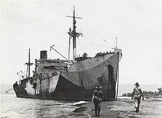 ![]() The wrecked Japanese ship Myoko Maru aground at Malahang in September 1943.