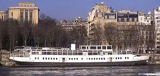 Ingenieur Minard was originally laid up in Cherbourg, but was moved to Le Havre on 26 April 1969. She lay idle for five years until bought by a private individual, Yvon Vincent, saving her from scrapping again. Her name was changed back to Nomadic and she was extensively converted into a floating restaurant and function vessel, and in October 1974 was relocated to the Seine in Paris.[2] A depiction of Nomadic was briefly seen alongside the Titanic in Cherbourg in James Cameron's 1997 film Titanic. By 1999, the business was in financial difficulties and Nomadic was seized by the Paris harbour authorities in 2002. The authorities removed some of Nomadic's superstructure to tow her below the Seine's bridges. On 1 April 2002 she was towed out of Paris to Le Havre.[2][3]