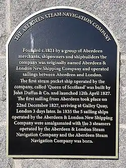 - ^ W. Hamish Fraser, Clive Howard Lee Aberdeen, 1800-2000: A New History 1862321086 2000 - Page 76 "The others were all smaller concerns, of which the best known was John Duffus & Co. A later, but ... This was a wooden-hulled coastal paddle steamer, the Queen of Scotland, built for the Aberdeen Steam Navigation Co. Aberdeen's first ..."