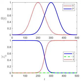 With the mixing angle is defined as .[1] From this, the STIRAP counter-intuitive pulse sequence can be deduced. At which corresponds the presence of only the Stokes field (), the dark state exactly corresponds to the initial state . As the mixing angle is rotated from to , the dark state smoothly interpolates from purely state to purely state . The latter case corresponds to the opposing limit of a strong pump field (). Practically, this corresponds to applying Stokes and pump field pulses to the system with a slight delay between while still maintaining significant temporal overlap between pulses; the delay provides the correct limiting behavior and the overlap ensures adiabatic evolution. A population initially prepared in state will adiabatically follow the dark state and end up in state without populating state as desired. The pulse envelopes can take on fairly arbitrary shape so long as the time rate of change of the mixing angle is slow compared to the energy splitting with respect to the non-dark states. This adiabatic condition takes its simplest form at the single-photon resonance condition where it can be expressed as