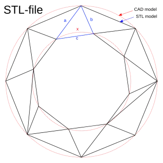 ![]() A CAD representation of a torus (shown as two concentric red circles) and an STL approximation of the same shape (composed of triangular planes) | |