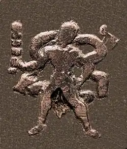 ![]() Saṃkarṣaṇa on a coin of Agathocles of Bactria, c. 190-180 BCE.[1][2] This is "the earliest unambiguous image" of the deity.[3][4] | |