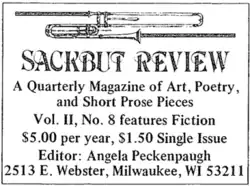 Sackbut Review was an American quarterly magazine published in Milwaukee, Wisconsin from 1978 until 1981. Founded and edited by Angela Peckenpaugh, the periodical's primary content were art, poetry, and short prose pieces.[1][2]