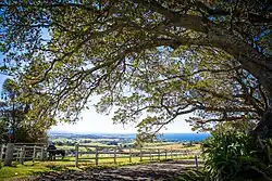 The foothills go down to Kiama and Gerringong and the sea and down to Jamberoo Valley and the Minnamurra River. The entire area was once covered by a subtropical rainforest known as the Illawarra Scrub but is now restricted to a small area around the summit lookout. The foothills include much dairy farming, and many historic dry walls remain. On the eastern ridge of the mountain is Saddleback House and in the northern foothills is Jerrara Dam, the region's first water supply, built in the 19th century. Just north of the summit is a second peak, lesser known, called Mount Brandon. Approximately three kilometres (1.9 mi) south is Fox Mountain, an extension of Saddleback with its own peak.
