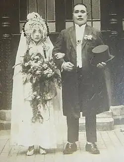 She married a railroad official, Huang, in 1908. He died in the beginning of the Republican Era.[14] Afterwards she had lived with a Mr. Cao.[12] Subsequently she married a member of the National Assembly,[4] Wei Sijiong, who was a former head of the Jiangxi Province Bureau of Civil Affairs. On 20 June 1918 they married in Shanghai. Sai Jinhua adopted the art name (hao) Weizhao Lingfei, which used a combination of her family name with that of her husband, to show her devotion to him. The couple moved to Beijing (then romanized as Peking).[12] Sai Jinhua's mother died in 1922. Wei Sijiong, Sai Jinhua's husband, died shortly afterwards and his family refused to allow Sai Jinhua to share his property. The widow began smoking opium and she lived in solitude in her remaining years.[6] Sai Jinhua, who was in poverty at the time of her death,[4] subsisted off of the money curious historians and journalists gave her.[11]