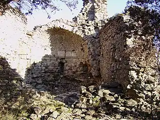 The collapsed vault of the rectangular nave must have been barrel-vaulted.[4] Access to the church was through a door in the south wall, which has completely collapsed. There may also have been another small door to the north.[4][5] The nave is lit from the west by a small round-headed window. The nave was constructed from irregular stones, which may have been reinforced at the corners with larger, better-squared blocks.[5]