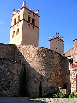 The exterior has two bell towers from different ages. The larger one is located next to the transept and nave. The façade has several Romanesque sculptures and tombstones of monks and local notables. The main portal has an architrave with bas-reliefs commissioned by abbot Guillaume and realized in 1020-21 in white marble from Céret. In the middle is portrayed Christ in majesty in a mandorla, supported by two archangels and flanked by two groups of three figures under arcades of Mozarabic horseshoe arches, over which to either side of the mandorla is the inscription ANNO VIDESIMO QUARTO RENNATE ROTBERTO REGE WILIELMUS GRATIA ABA ISTA OPERA FIERI IUSSIT IN ONORE SANCTI GENESII CENOBII QUE VOCANT FONTANES, which translates to "In the twenty-fourth year of the reign of King Robert, William, by the grace [of God] abbot, ordered this work to be made in honour of Saint Genesius the hermit, which is called Fontanes." The 24th year of the reign of King Robert II of France was 1020-21.[1] A similar sculpture, perhaps by the same artist, is also present in the Abbey of St. Andrew, 4 km from Saint-Génis-des-Fontaines Abbey.