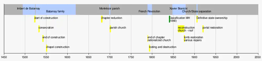 Around 1520, Imbert de Batarnay, lord of Bridoré and Montrésor, had the idea of founding a collegiate church in which he and his family would be buried. His first choice was Bridoré, where he owned a medieval fortress,[5] and the project moved forward as early as March 1519.[6] However, in 1521, for unknown reasons, Imbert de Batarnay changed his mind and decided that the foundation would ultimately take place in Montrésor, not far from his Renaissance dwelling, as the 13th-century castral chapel was probably too cramped; construction began in March 1522.[7] Imbert de Batarnay endowed the collegiate church with "a college of five prebendal canons required to sing a daily high mass and canonical hours, with two young children instructed in reading and singing";[8] the number of canons was soon increased to twelve.[9] Imbert de Batarnay died in 1523. Since the church under construction was not yet suitable for his burial, he was buried in the château chapel before his body was relocated to the choir of the new collegiate church; the date of the transfer of his ashes is unknown.[10] The church was consecrated on December 10, 1532[11] by Archbishop Antoine de Bar, after completion of the structural work, but the work was not completed until 1541.[12] Work soon resumed, however, given that around 1550, at the instigation of René de Batarnay, Imbert's son, a chapel was built against the south side of the choir. It was dedicated to Notre-Dame-de-Lorette, in homage to the Basilica della Santa Casa, in the Italian province of Ancona, whose pilgrimages were renowned at the time.[13]