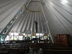 Built by National Artist for Architecture Leandro Locsin in 1968, the design of this parish church is symbolic of the manner the martyr died: crucified on an X-shaped cross. The butterfly shaped floor plan emanates from this cruciform. Many other symbolic features mark the tent-like structure, including the giant chandelier over the altar which serves as a halo over the copper cross by National Artist for Visual Art Vicente Manansala.[3]