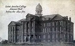 Alumni Hall was constructed by the Benedictine monks and local contractors from 1891 through the winter of 1892; the building was designed by Patrick W. Ford, an Irish-American architect from Boston.[19] Nearing completion in February 1892, all that remained was for workers to continue to plaster the interior walls. A fire, which was most likely caused by an open heating stove's grate, sparked an ember and destroyed the entire structure. No one was seriously hurt because of the fire. The monks were forced to rebuild the college, spending considerably less money on the construction, as they had received only $55,000 from the Insurance Commissioner of the State of New Hampshire.[20] In an effort to save money, bricks were salvaged from the previous structure and pieces of granite were cut from large granite rocks still visible on the current quad. In 1893, the building that is the center of campus was completed; the fire delayed the first academic semester by one year. On October 11, 1893, the college was officially rededicated. To avoid the possibility of another fire, a power house was constructed separately from the building. Farmland complete with livestock, beanpoles and tomato plants lined the present-day quad and adjacent fields. In 1912, the bell tower and ivy were added to the building; in 1923, the college's second chapel (the first being located on the second floor at the present-day business office) was constructed as a connecting wing. Today this second chapel is the college's Chapel Arts Center, which hosts art exhibits and other cultural events. It still boasts ornate stained glass windows and painted ceilings.[21]